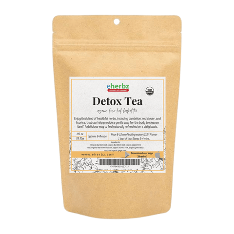 Ingredients: Organic burdock root, organic dandelion root, organic peppermint leaf, organic red clover blossom, organic licorice root, organic yellowdock root, and organic ginger root.